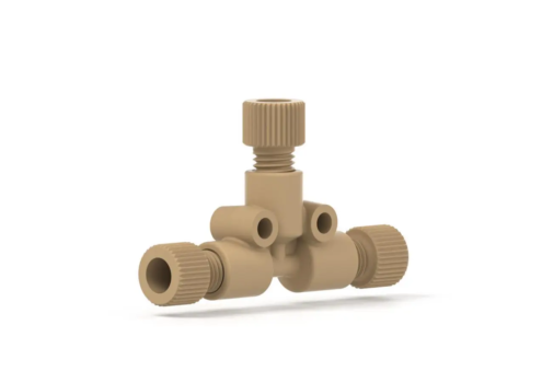 Our PEEK Low Pressure Tee Assembly is strong and durable handling a pressure rating 500 psi . It has excellent chemical resistance to commonly used solvents. Our assembly comes equipped with conveniently placed mounting holes. This assembly comes complete with (3) P-335 Nuts. Brochure