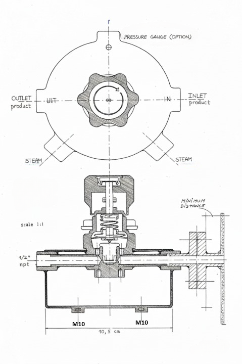 Saturated steam is introduced through a dedicated inlet and circulates throughout the entire jacket, enveloping the regulator body. This ensures the backpressure regulator is heated as a single, uniform thermal block. By maintaining the process media at a consistent temperature from the inlet to the outlet, the risk of product solidification or crystallization on the valve seat is eliminated, ensuring a stable and repeatable pressure setpoint.